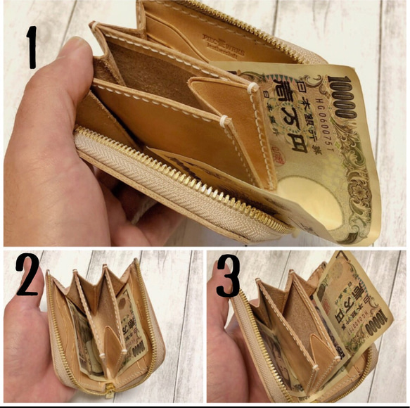 こちらは受注製作となります。お支払い完了後の製作となります。 *製作期間はプロフィールに記載しております。 別で出品中のオプションで小銭入れ横にレシートやカードを入れられるパーツを追加できるようになりました。併せてご検討お願い致します。 内装画像は小銭入れ横ポケットを付けた物になります。 オプション購入なしの場合は小銭入れ横ポケットは付きませんのでご注意願います。 【小銭入れサイドポケット追加オプション 】 外装:艶が美しく年々希少価値が上がっているコードバンの中でも、さらに入手困難なホーウィン社のシェルコードバンを使用しております。 入荷時からの薄い線キズ. 色ムラ. 毛穴など、アメリカンクオリティですが、ワイルドな天然皮革感とコードバンの艶がそれを打ち消してくれます。 内装:サドルレザー 片側マチ無しにする事でお札を折らずに入れる事を可能にしました。 他には無いタイプのお札の入れ方、出し方で 二つ折りにして入れる 出して広げるという煩わしさが無く、小銭入れも両側マチ付きで取り出しやすく 会計時に[ワンアクション]でスムーズにお支払いできるミニウォレットです。 最後の画像の様に小銭入れ部のマチを押すなどして 小銭入れを持ち上げた状態にするとお札を入れやすいと思います。入れるのは慣れてしまえば簡単です。 お札は二つ折りの場合は縦でも横でも入ります。 お釣りを受け取り、上記の入れ方ですぐに入れ難い場合にはとりあえず二つ折りで素早く入れておけばスムーズにレジから撤収できます。 お札を出す時は引っ張ればスルっと出ます。 もちろん逆さまにして振っても小銭がカード入れ側に出てしまう事はありません。 これだけで財布としての機能は充分ありますので小さなバッグで出かける時にも重宝します。 ファスナーはYKKエクセラを使用しており、務歯全てに磨きがかけられている 非常に綺麗なファスナーで使い込む程滑らかになっていきます。 金具はゴールド (ゴールデンブラス) シルバー(ニッケル) 布地は黒 焦茶 ベージュ、から選択できます。 (ファスナーその他カラーをご希望の場合は別で出品中の【ファスナー布地. 金具取り寄せカラーサンプル】の方を一緒に購入して下さい) 【ファスナー布地. 金具取り寄せオーダー用ページ】 素材 外装 Horween shell cordvan 内装 サドルレザー カード入れ3段×2 サイズ 約11×9.5×2.5 (cm)